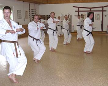Im ersten Training beschäftigten wir uns vorwiegend mit den Grundlagen der Tsuki waza.Sensei Christian Lind wies besonders auf die Bedeutung der Einheit zwischen Technik und Fußbewegung hin. Es muss eine Harmonie zwischen Tsuki und Sabaki geben. Weiterhin erklärte er, wie die Faust beschleunigt werden muss. Er verglich dabei die Beschleunigung der Faust mit der Beschleunigung eines Hundertmeter-Läufers. Der Hundertmeter-Läufer hat bei ca. 60m seine maximale Geschwindigkeit erreicht. Der Tsuki aber soll nicht am Anfang so schnell wie möglich beschleunigt werden, sondern gleichmäßig, so dass am Ende der Technik die maximale Geschwindigkeit erreicht wird. Daraufhin übten wir die verschiedensten Tsuki. Choku zuki, Mawashi zuki, Furi zuki und Kagi zuki wurden behandelt.