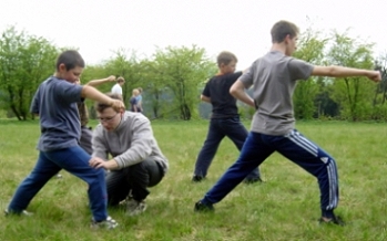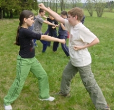 Zum ersten Mal befassen wir uns intensiv mit den Tuishou (chin.), „klebenden“ oder „schiebenden Händen“. Wir beginnen mit der „Elefantenübung“ und versuchen durch maßvolles Schieben, Drücken und Ziehen den Partner aus dem Gleichgewicht zu bringen. Dass dabei wie auch bei allen anderen Übungen zur Selbstverteidigung die Hüfte die entscheidende Kraft einbringt, erkennen wir dabei nicht, so sehr sind wir mit den Armen beschäftigt. Beim einfachen Kreisen wird der Ablauf schon differenzierter. Wir lernen, wie man den Angriff kommen lässt, dabei aber trotzdem am Gegner bleibt und erst kurz vor dem eigentlichen Stoß mit der Hüfte abdreht. Dass man dabei im Gleichgewicht bleiben muss, sich nicht überdrehen darf, den Rücken gerade halten muss, ist ein Zusammenspiel, das es in sich hat. Als wir Anfänger zusammen üben, haben wir starke Koordinationsprobleme, doch am nächsten Tag geht alles schon viel besser. Wir erlernen das einfache Kreisen mit Unterstützung, das Ableiten eines Angriffes nach oben und die „Wiege“.