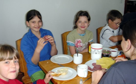 Auch im Haus in Föhlritz herrscht immer Leben. Drei Kinder und neun Erwachsene; da ist jeder mal dran mit Spielen, Lesen, Hopsen, Tragen und vor allem Lachen. Viele Gespräche zwischen den einzelnen Teilnehmern und unsere abendliche Runde bei Rotwein geben dem Zusammensein Tiefe und hinterlassen bleibende Erinnerungen an eine schöne Woche in der Rhön.