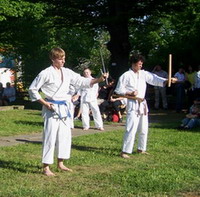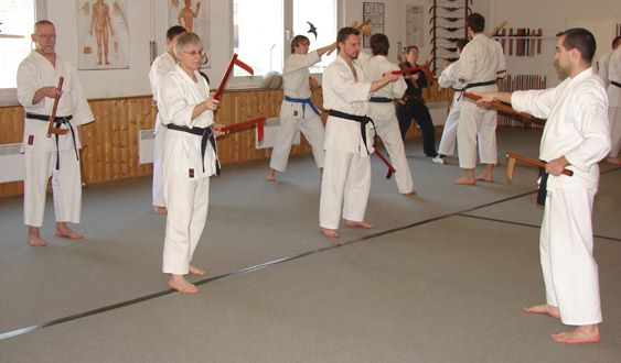 Schon am Freitagabend haben einige aus unserem Dojo und andere am Training in Bensheim teilgenommen. In diesem Training ging es um die Heian Godan und einige Kihonformen dieser Kata. Das Freitagabendtraining haben Sensei Ursel Arnold und Sensei Christian Lind geleitet. Am Samstagmorgen füllte sich nach und nach der Budokan, es kamen viele Vereine aus allen Ecken Deutschlands. Um 11.00 Uhr leiteten Sensei Christian Lind, Sensei Peter Schömbs und Sensei Ursel Arnold das Training ein. Wegen des Platzmangels wurde das Training auf den naheliegenden Sportplatz verlegt. Es wurde in verschiedenen Gruppen die Kata Taikyoku nidan geübt. Danach wurde eine Stunde Waffentraining mit verschiedenen Waffen unterrichtet: Tonfa, Sai, Bo, Hanbo, Ken, Kama und Seil. Nach einer kurzen Mittagspause ging es weiter, im Dojo. Es gab zwei Trainingsangebote, Nei yang gong und Renzuko waza. Nei yang gong bedeutet „Innere nährende Übungen“; dies hat Gabi Fischer-Lind geleitet. Das Renzuko-waza-Training stand unter der Leitung von Sensei Christian Lind und Sensei Marcus Neudert. Das dritte Trainingsangebot wurde auf den nächsten Tag verlegt, weil es sonst zu spät geworden wäre.