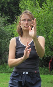 Im Mittelpunkt des Seminars stand diesmal das Üben und Vertiefen der bereits bekannten Formen und Anwendungen, sowie Übungen aus dem Tuishou. Dabei richtete sich unsere Aufmerksamkeit darauf, die Peking-Form entspannt, aber zugleich auch kraftvoll zu üben. Immer wieder korrigierten wir unsere Körperhaltung und verfeinerten mit Hilfe von Gabi Fischer-Lind Details einzelner Bewegungsabläufe. Kamen uns einige der Bewegungen bisher etwas unlogisch und nicht ganz rund vor, so stellte sich an diesem Wochenende mehr als nur einmal der „Aha-Effekt“ ein. Vieles erscheint jetzt logischer und harmonischer. Einen weiteren Übungspunkt bildete die innere Arbeit beim Laufen der Form. Da meine Aufmerksamkeit jedoch nach wie vor noch hauptsächlich auf den Ablauf der Form und weniger auf das Dantian gerichtet ist, gelang es mir nicht so richtig, die inneren Vorgänge beim Üben zu spüren.