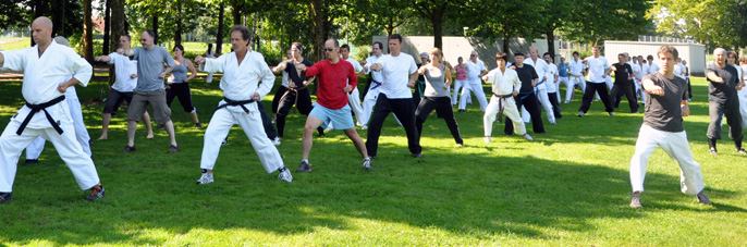 Angekommen stehen Armeen saftiger Steaks für das Essen bereit. Wieder entwickeln sich Gespräche und Diskussionen, diesmal besonders mit Angehörigen anderer Stile. Später findet im Dojo eine Vorführung der Schwarzgurte aller Stile statt, von Goshin-Vorführungen, den Bo-Kumite von Hendrik und Felix über einige unbekannte Kata der angereisten Slowaken und diversen Waffenvorführungen bis hin zu den schlangenähnlichen Formen des Qigongs. Nach den Demonstrationen gibt es reichlich Gelegenheit, gezielte Fragen zu den Geheimnissen der Techniken zu stellen. Nach ein paar Vorführungen, die sich spaßig mit dem Thema Karate auseinandersetzen, geht auch dieser Tag zu Ende.