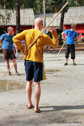 Besonderes Augenmerk wurde bei diesem Trainingskurs darauf gelegt, bereits erlernte Techniken, Bewegungen und Formen noch einmal komplett zu überprüfen, zu korrigieren und kontrollieren. Nach der intensiven Erwärmung widmeten wir uns somit dem Bogenschritt im richtigen Schrittmaß und arbeiteten an unserer geraden, gesunkenen Körperhaltung, wobei Irina und Ute wertvolle Tipps gaben. Dieses besonders langsame Laufen der Taiji-Formen zeigte dann auch schnell seine Wirkung in den entsprechenden Muskelgruppen. Zum Abschluss der ersten Trainingshälfte sind wir dann die von uns im ersten Trainingsjahr bereits erlernte kurze Taijiquan-Form gelaufen, wobei jedes Trainingsmitglied einmal die Führung der Form übernehmen durfte. Dabei wurden die Inhalte des Trainings noch einmal besonders hervorgehoben, wie schulterbreiter Stand, gesunkene Haltung, gerader Rücken, langsame, fließende Bewegungen und richtige Gewichtsverlagerung in der Form.