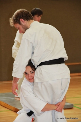 Der zweite Tag schloss das Thema mit einer Zusammenfassung ab. Nach einem intensiven Intervall-Training (auf die Frage Olafs, ob es jemandem noch kalt sei, gab es eine Ja-Stimme...) übten wir das Kamae waza futari geiko in einer sehr spannenden Art und Weise. Es fanden sich jeweils drei Übende zusammen. Einer stellte sich in die Mitte und übte jeweils eine des zwölf Sequenzen. Er wurde jeweils von den äußeren Partnern sechsmal angegriffen, bis der nächste in die Mitte kam. Der Vorteil dieser Übungsform ist das Trainieren mit unterschiedlichen Partnern. Bei voller Konzentration der drei Übungspartner können Fehler in der Bewegung entdeckt und abgestellt werden.