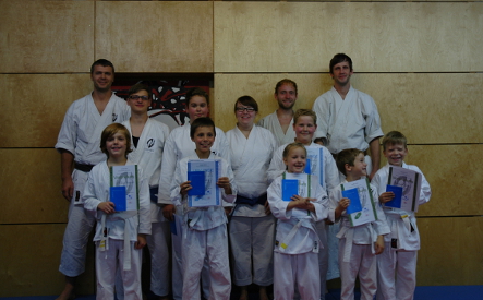 Am genannten Freitag fanden im Fûryûkan wieder einmal Haupt- und Vor-Prüfungen im Kinder-Karate statt, wobei sich fünf junge Übende zum allerersten Mal dieser aufregenden Situation stellten. Wir gratulieren zum Bestehen des nächsten bzw. ersten Grades: Vincent Etterich, Friedrich Felber, Franz Klimpel, Nick Meiners, Justin Pilz, Fabian Richter, Simon Riedel, Jonas Rocker, Maximilian Schulze, Cindy Vetter und Philine Weber. HF